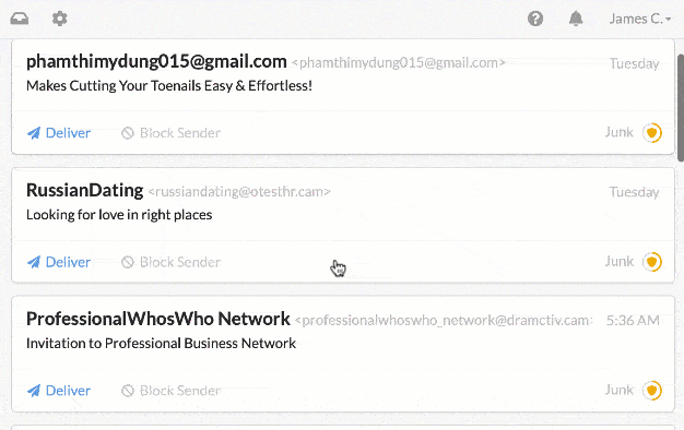 The message review page lets you quickly scan filtered emails and decide which ones to deliver to your inbox. The lower right corner of each message indicates quality and possible spoofing. Spoofing isn’t always malicious, many newsletters send from automated systems, but it’s smart to be cautious when deciding to deliver.